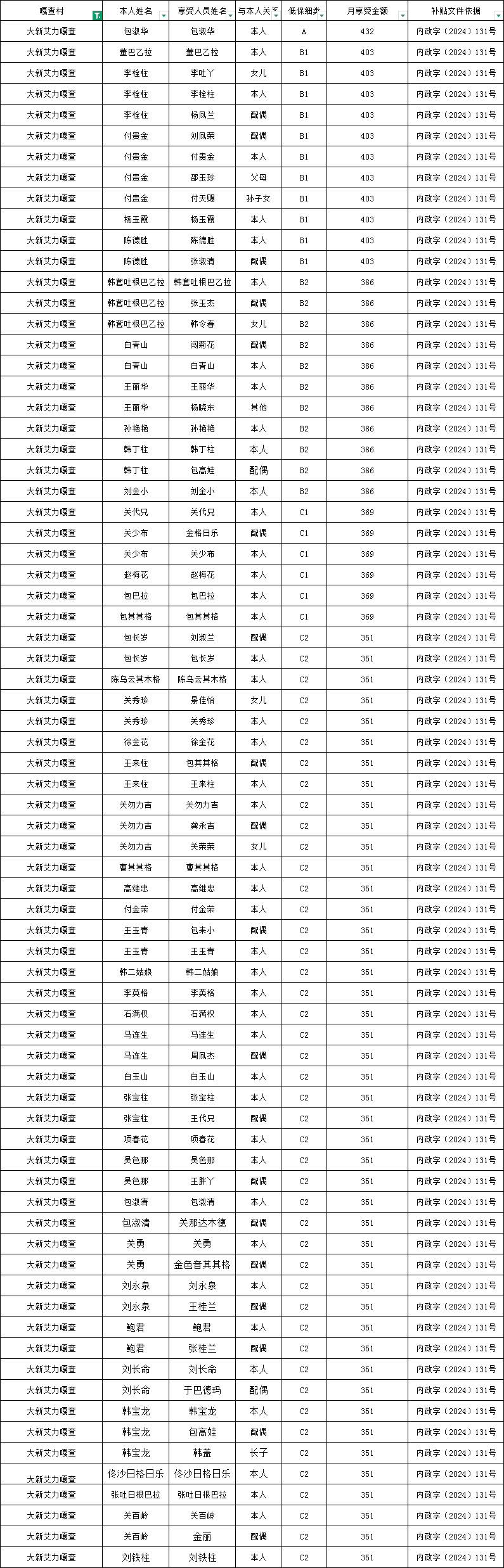 大新艾力嘎查2026年4月农村低保资金发放花名册