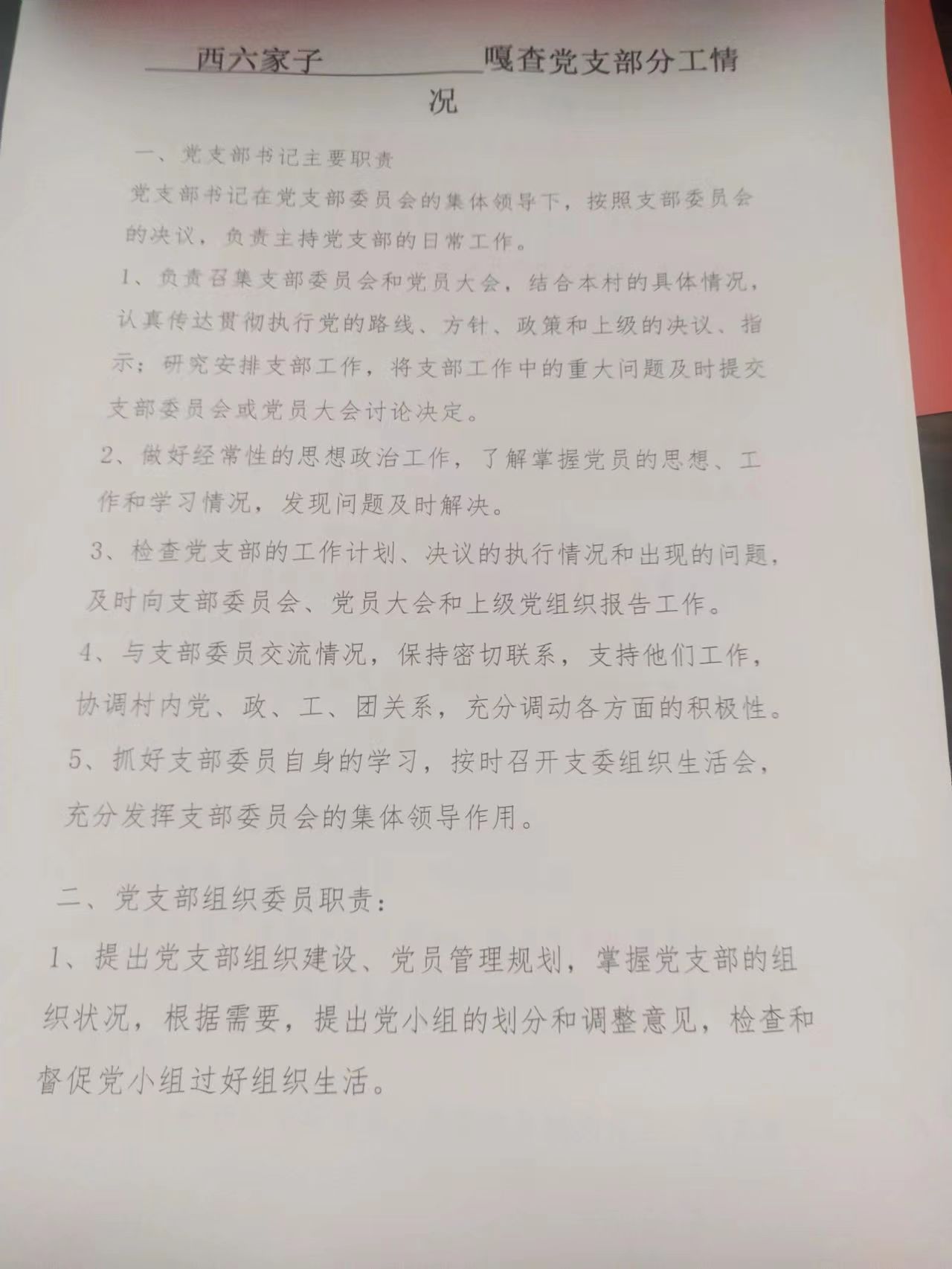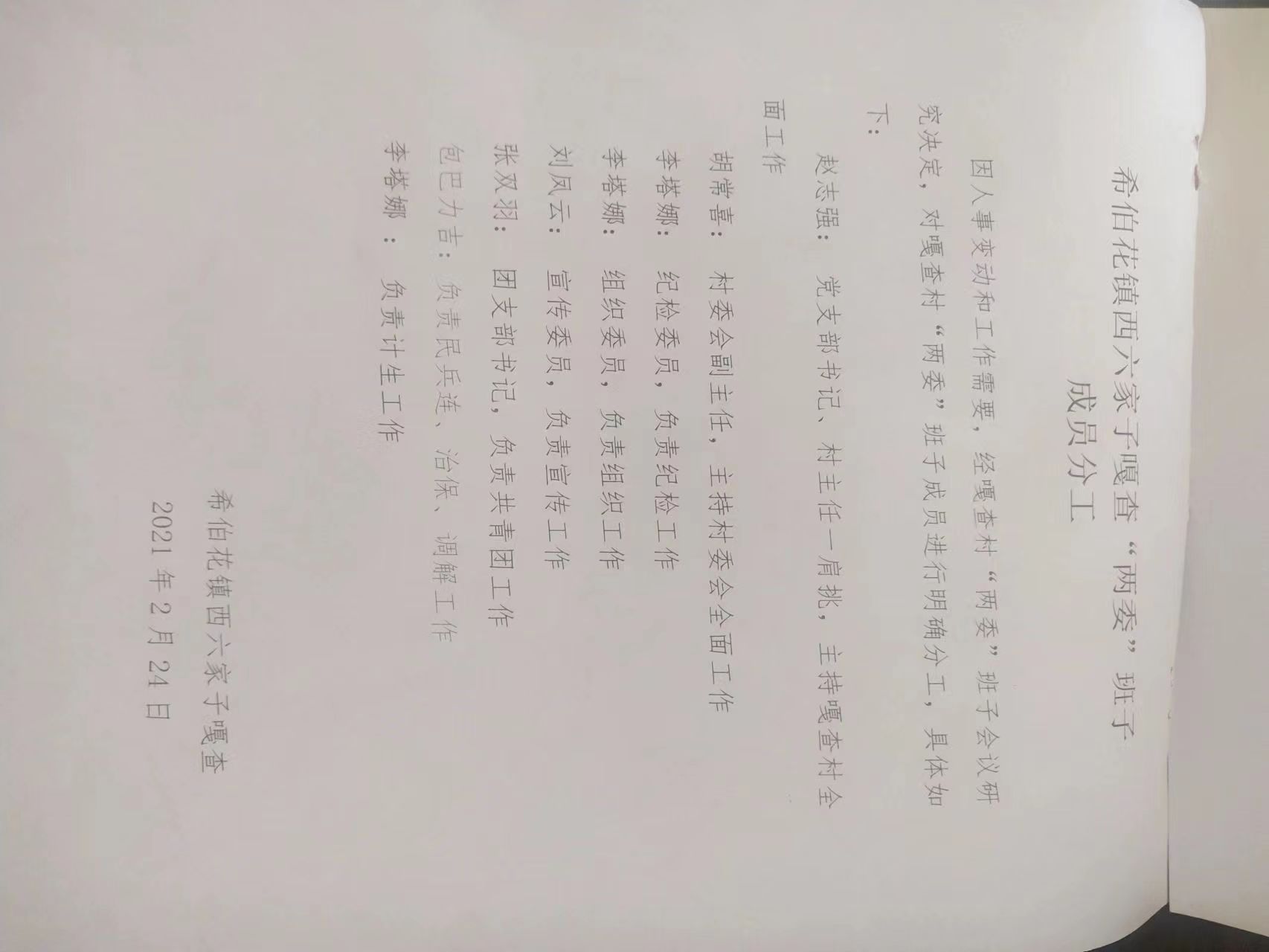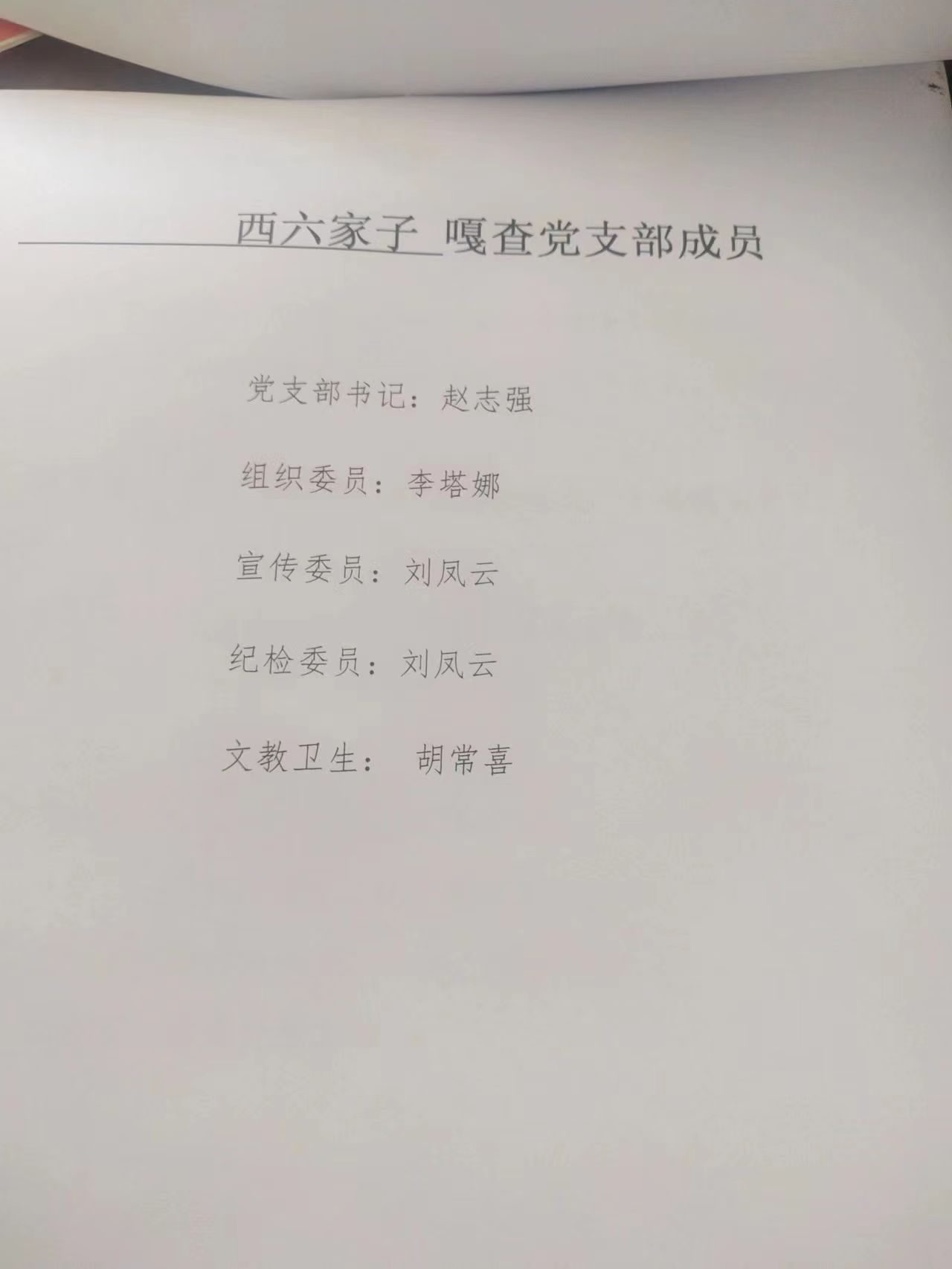 西六家子嘎查党支部成员及分工情况