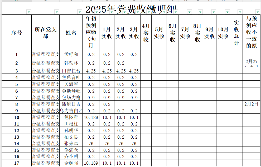 2025年巴彦塔拉镇巴彦毛都嘎查党支部1--3月份党费收缴明细