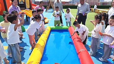 最热闹的是“赛龙舟”环节,在农牧局党员代表及社区志愿者的协助下,小朋友们拿着折好的纸船,两人一组在水池中“竞渡”,用手中的扇子为小船助力,其他小朋友在两旁助威呐喊,现场氛围紧张又热烈,充满欢声笑语。