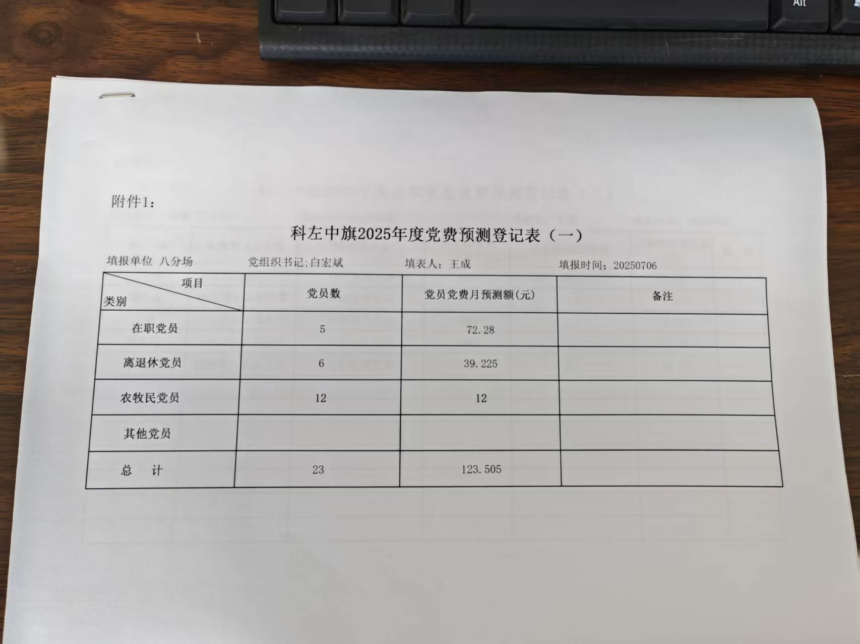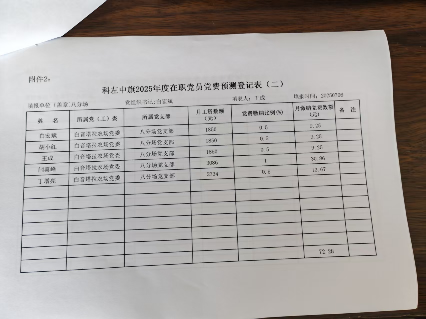 科左中旗2025年度党费预测登记表