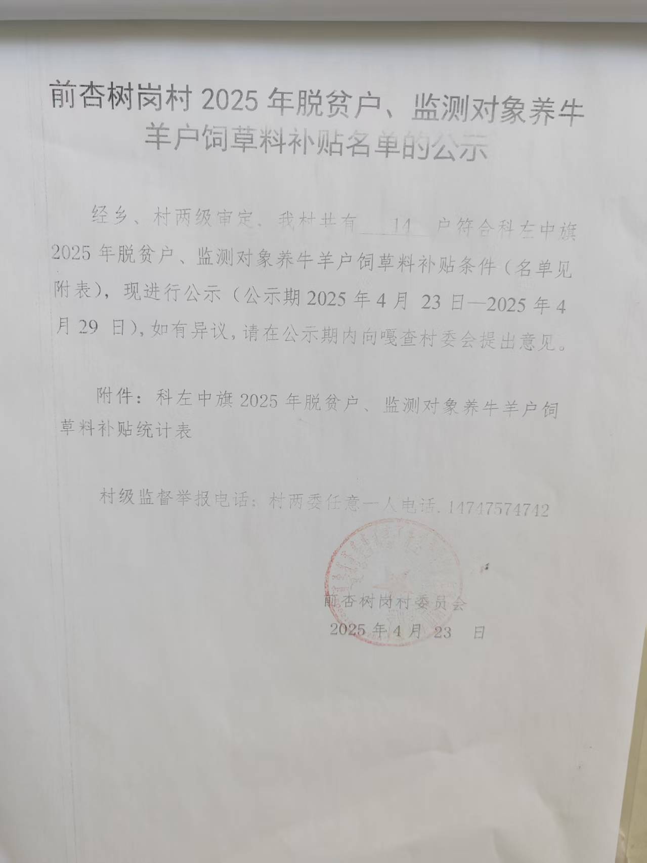2025年前杏树岗村脱贫户、监测对象养牛羊户饲草料补贴名单公示