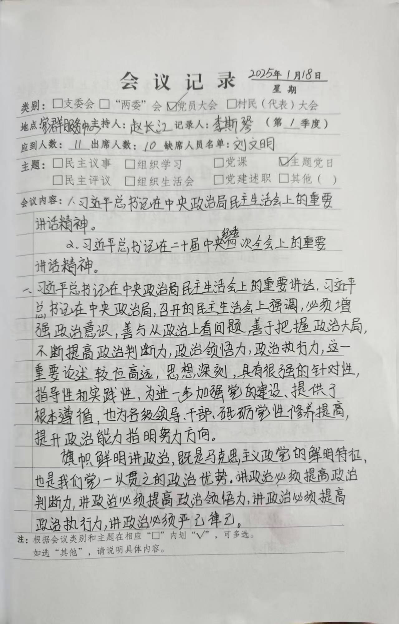 2025年1月18日,嘎达莫瑞嘎查党支部召开1月主题党日党课活动,参会党员10人,党支部书记赵长江主持集体学习会议,组织全体党员集中学习1、习近平总书记在中央政治局民主生活会上的重要讲话精神。2、习近平总书记在二十届中央纪委四次全会上的重要讲话精神。