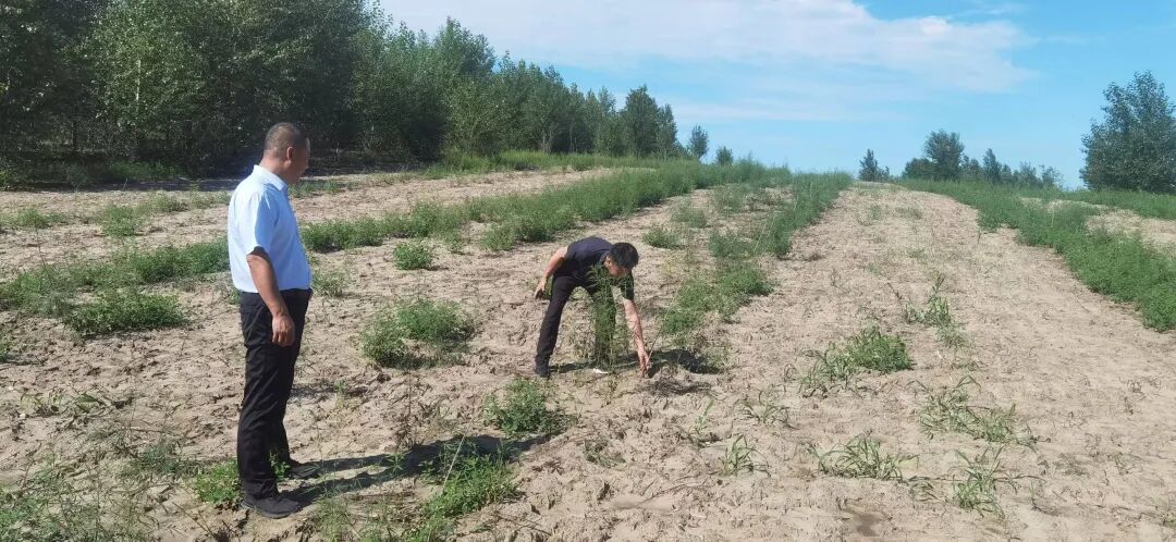 7月31日,架玛吐镇党委书记张志昌、镇人大主席单玉桩深入大新艾力嘎查实地核查案件图斑整改区植被恢复成活情况。