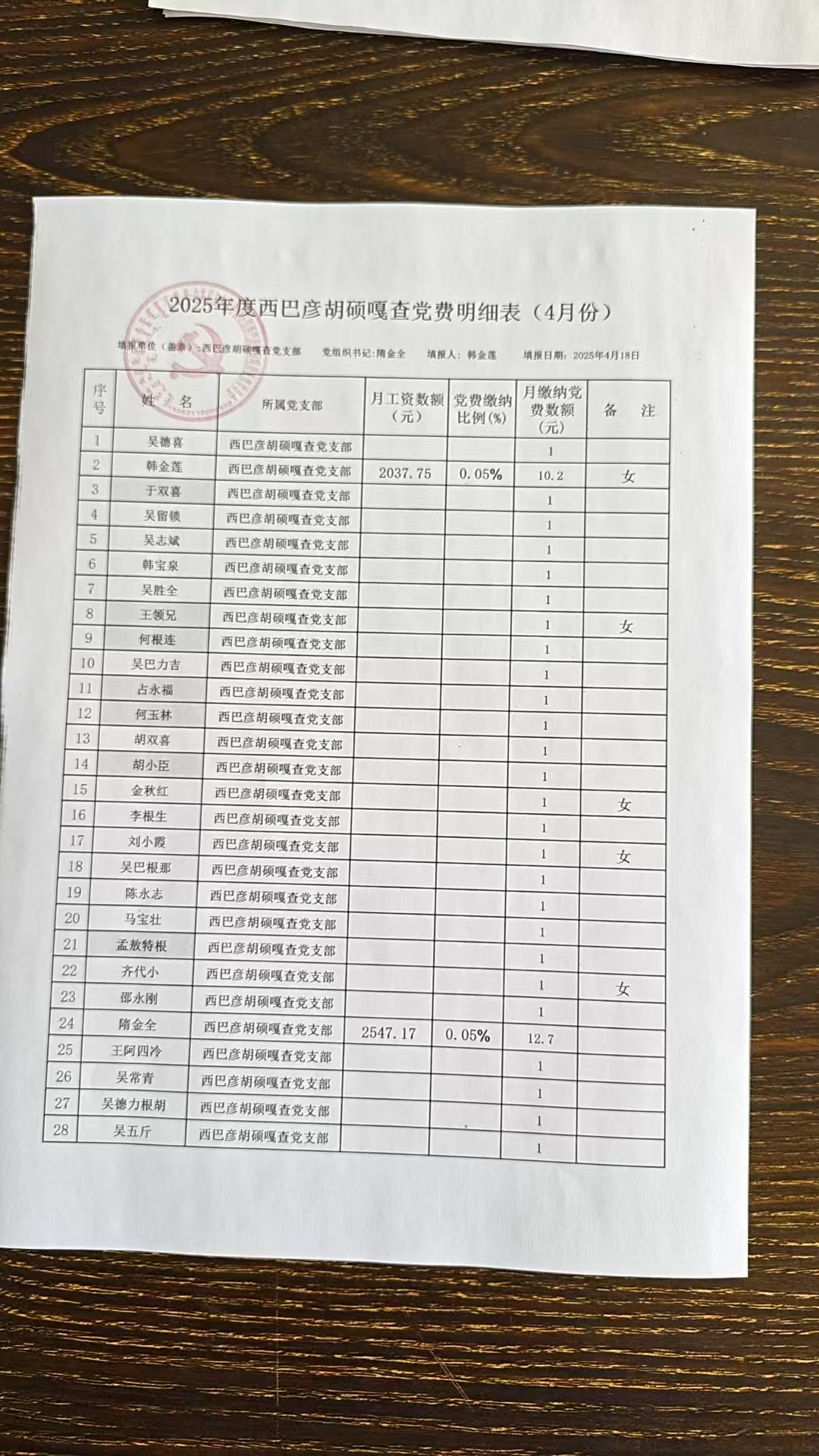 2025年4月份党费
