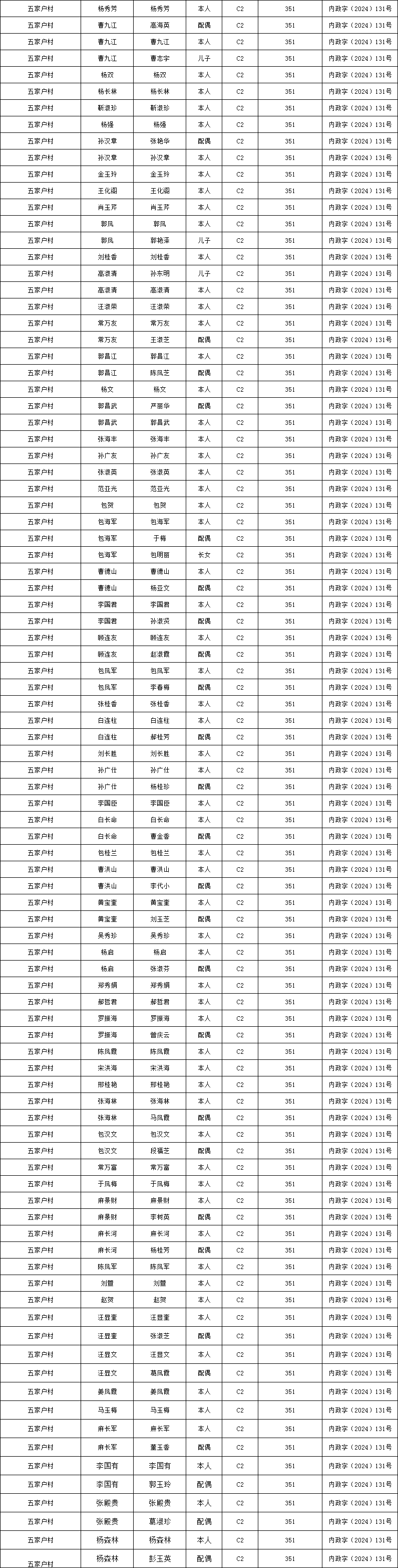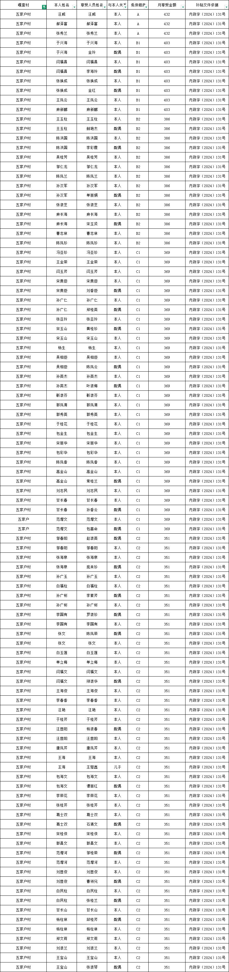 五家户村2025年9月农村低保资金发放花名册