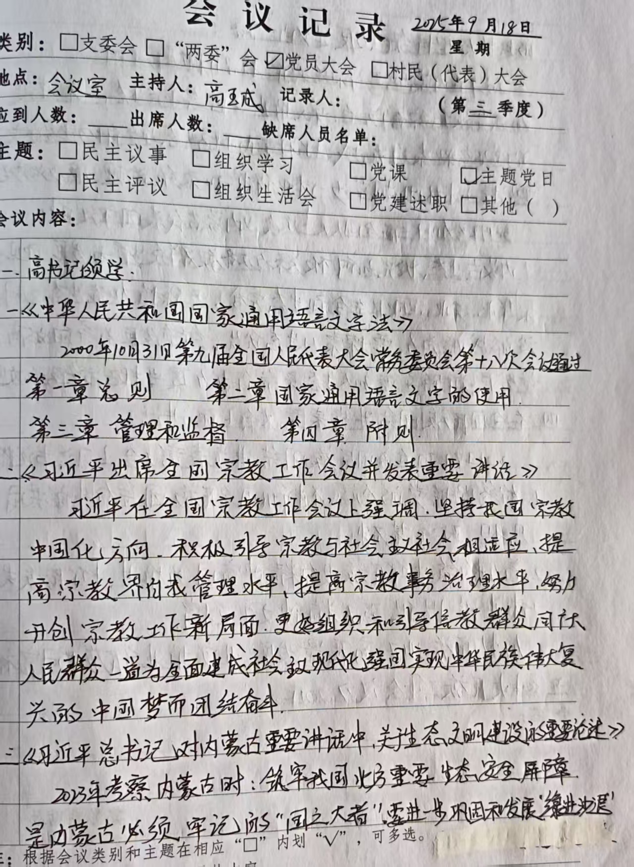 2025年9月18日主题党日组织党员集中学习