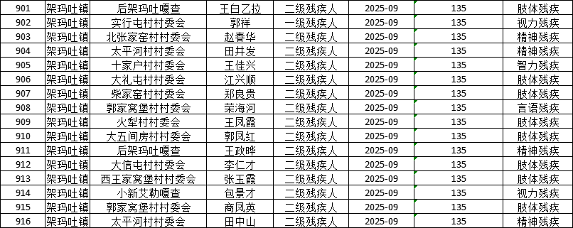 架玛吐镇2025年9月残疾人护理补贴发放花名册