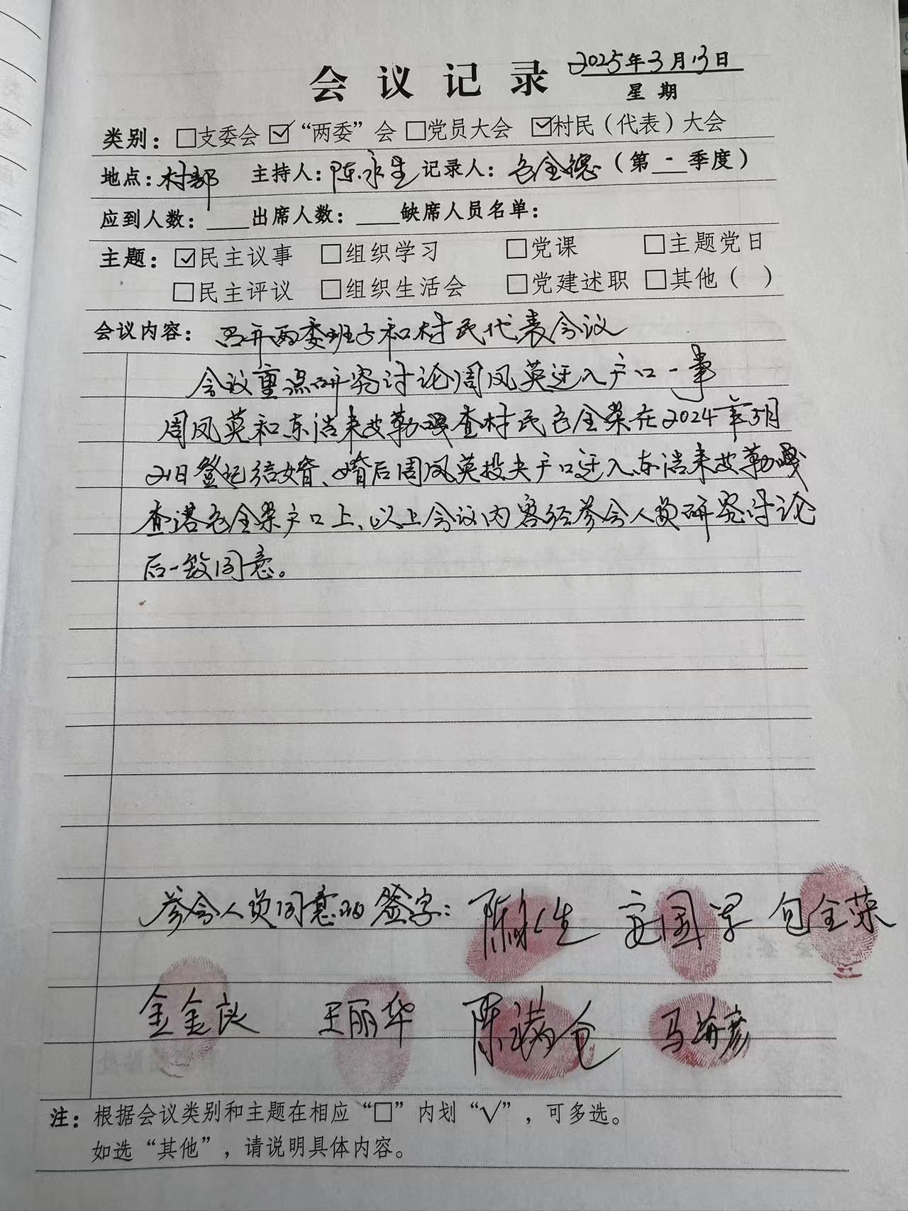 召开两委班子和村民代表会议,会议重点研究讨论周凤英迁入户口一事。