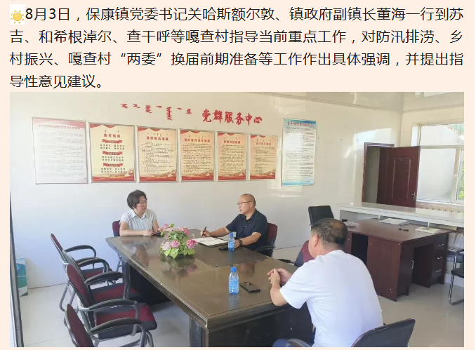 8月3日,保康镇党委书记关哈斯额尔敦、镇政府副镇长董海一行到苏吉、和希根淖尔、查干呼等嘎查村指导当前重点工作,对防汛排涝、乡村振兴、嘎查村“两委”换届前期准备等工作作出具体强调,并提出指导性意见建议。