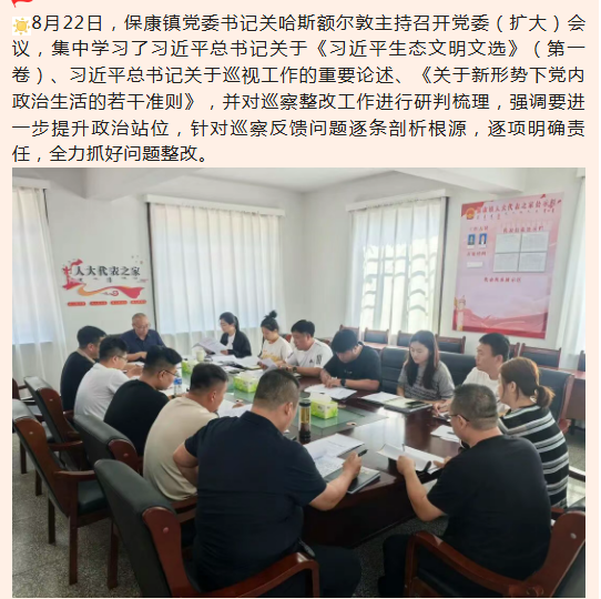 8月22日,保康镇党委书记关哈斯额尔敦主持召开党委(扩大)会议,集中学习了习近平总书记关于《习近平生态文明文选》(第一卷)、习近平总书记关于巡视工作的重要论述、《关于新形势下党内政治生活的若干准则》,并对巡察整改工作进行研判梳理,强调要进一步提升政治站位,针对巡察反馈问题逐条剖析根源,逐项明确责任,全力抓好问题整改。
