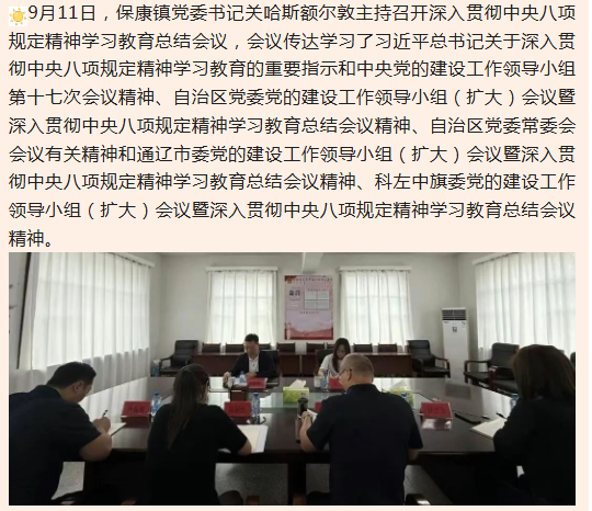 9月11日,保康镇党委书记关哈斯额尔敦主持召开深入贯彻中央八项规定精神学习教育总结会议