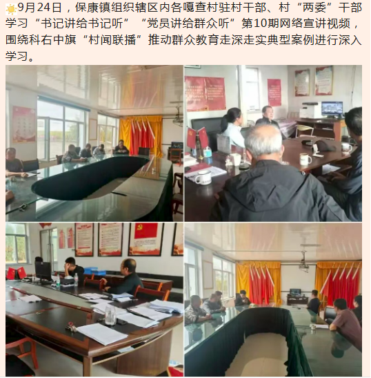 9月24日,保康镇组织辖区内各嘎查村驻村干部、村“两委”干部学习“书记讲给书记听”“党员讲给群众听”第10期网络宣讲视频,围绕科右中旗“村闻联播”推动群众教育走深走实典型案例进行深入学习。