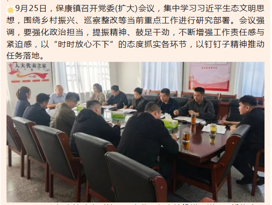 9月25日,保康镇召开党委(扩大)会议,集中学习习近平生态文明思想,围绕乡村振兴、巡察整改等当前重点工作进行研究部署。会议强调,要强化政治担当,提振精神、鼓足干劲,不断增强工作责任感与紧迫感,以“时时放心不下”的态度抓实各环节,以钉钉子精神推动任务落地。
