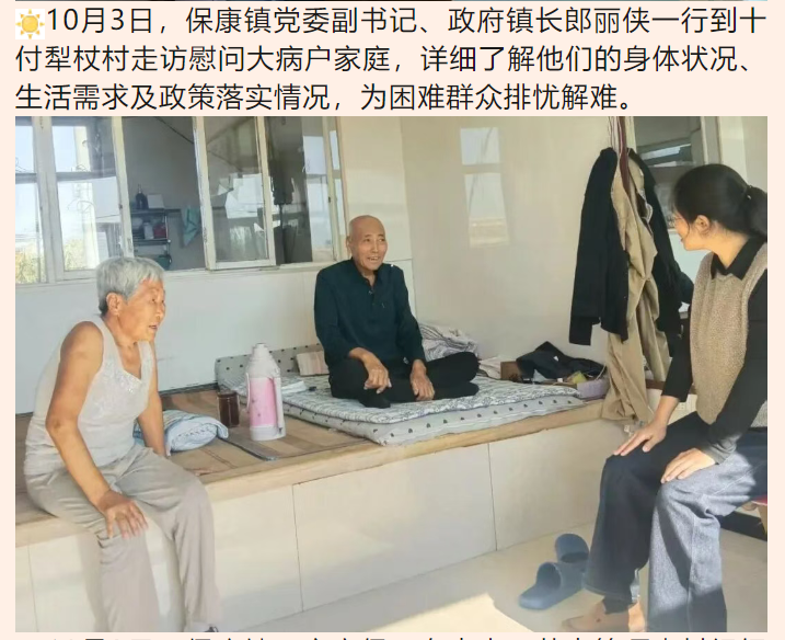 10月3日,保康镇党委副书记、政府镇长郎丽侠一行到十付犁杖村走访慰问大病户家庭,详细了解他们的身体状况、生活需求及政策落实情况,为困难群众排忧解难。