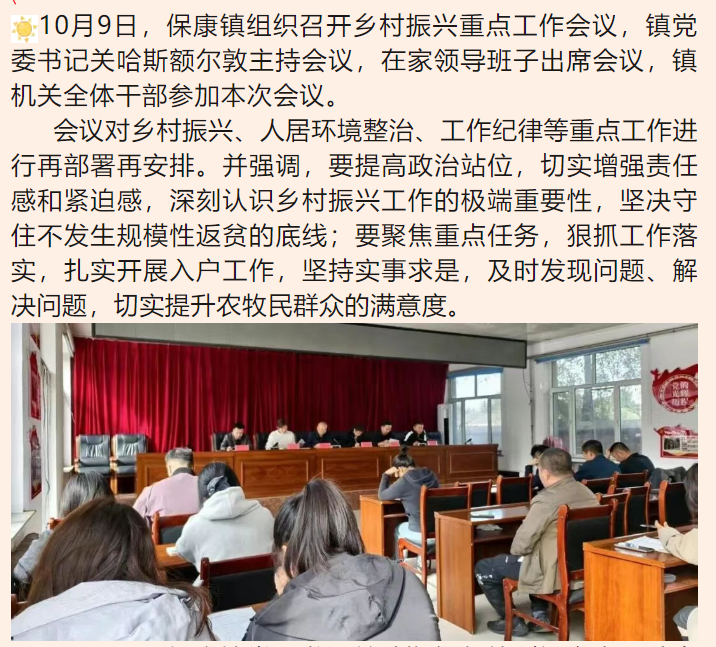 10月9日,保康镇组织召开乡村振兴重点工作会议,镇党委书记关哈斯额尔敦主持会议,在家领导班子出席会议,镇机关全体干部参加本次会议。