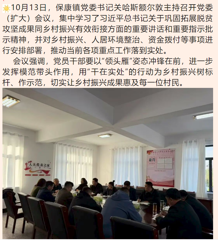 10月13日,保康镇党委书记关哈斯额尔敦主持召开党委(扩大)会议,集中学习了习近平总书记关于巩固拓展脱贫攻坚成果同乡村振兴有效衔接方面的重要讲话和重要指示批示精神,并对乡村振兴、人居环境整治、资金拨付等事项进行安排部署,推动当前各项重点工作落到实处。