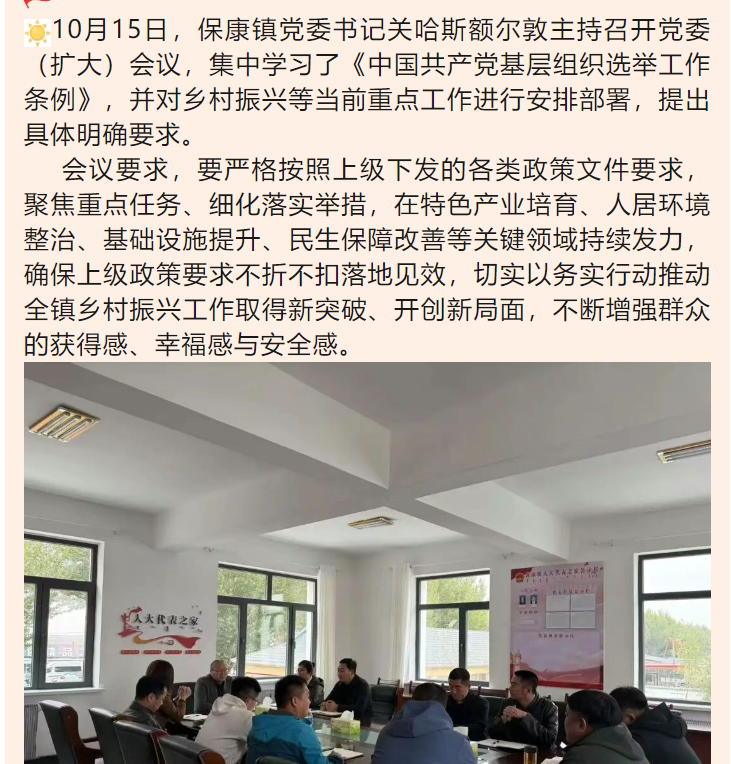 10月15日,保康镇党委书记关哈斯额尔敦主持召开党委(扩大)会议,集中学习了《中国共产党基层组织选举工作条例》,并对乡村振兴等当前重点工作进行安排部署,提出具体明确要求。