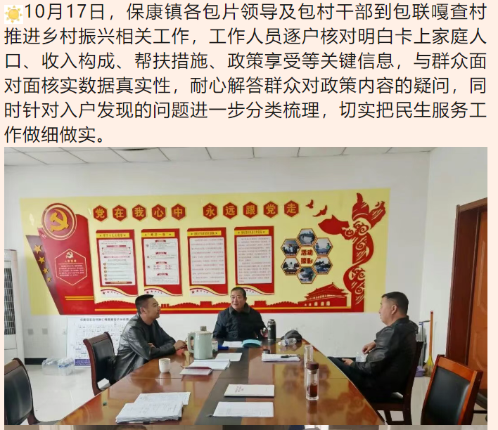 10月17日,保康镇各包片领导及包村干部到包联嘎查村推进乡村振兴相关工作,工作人员逐户核对明白卡上家庭人口、收入构成、帮扶措施、政策享受等关键信息,切实把民生服务工作做细做实。