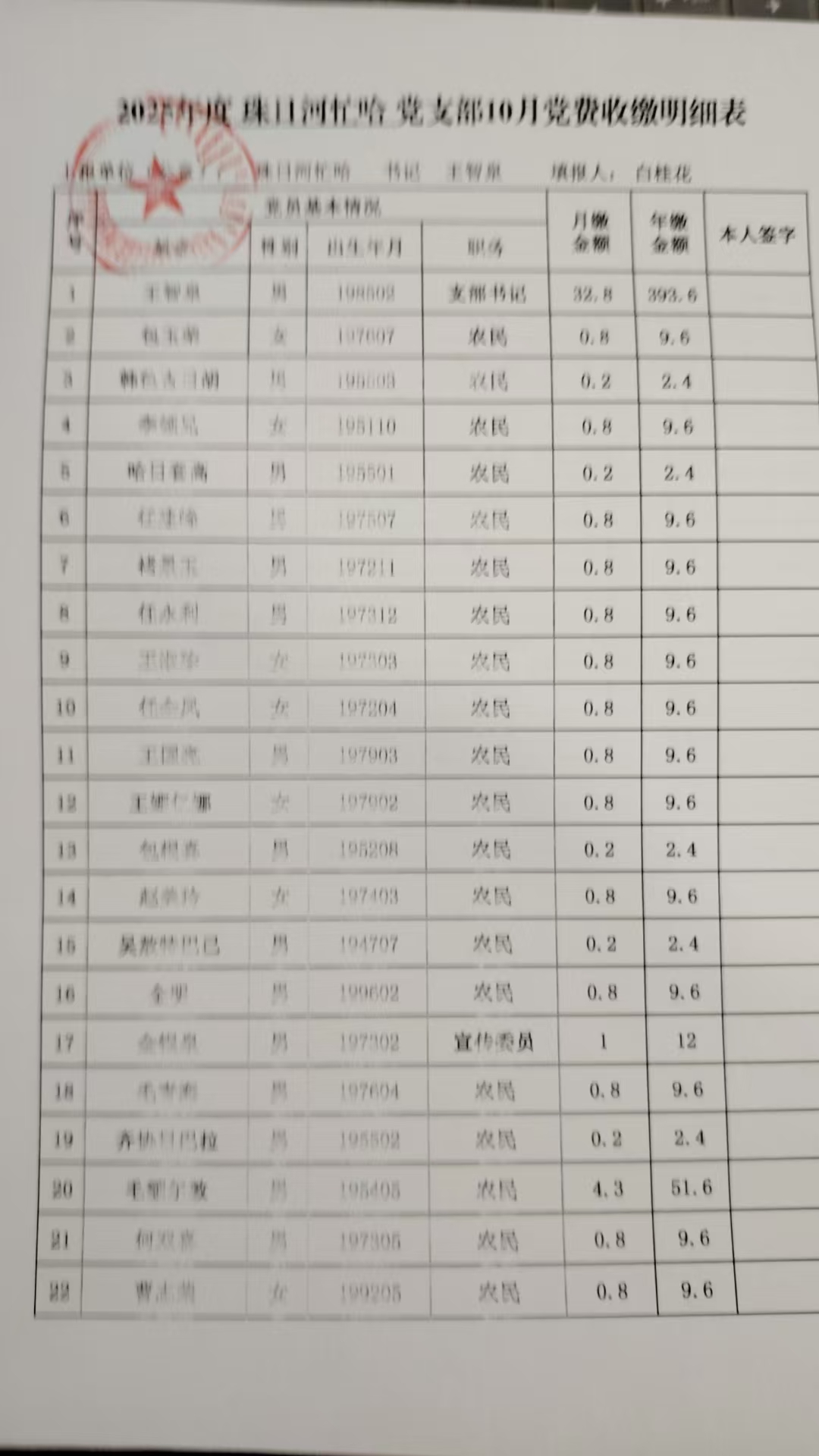 2025年10月党费收缴明细表