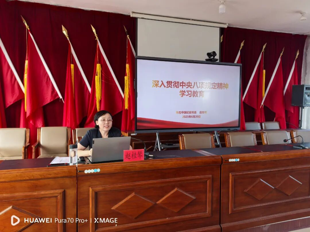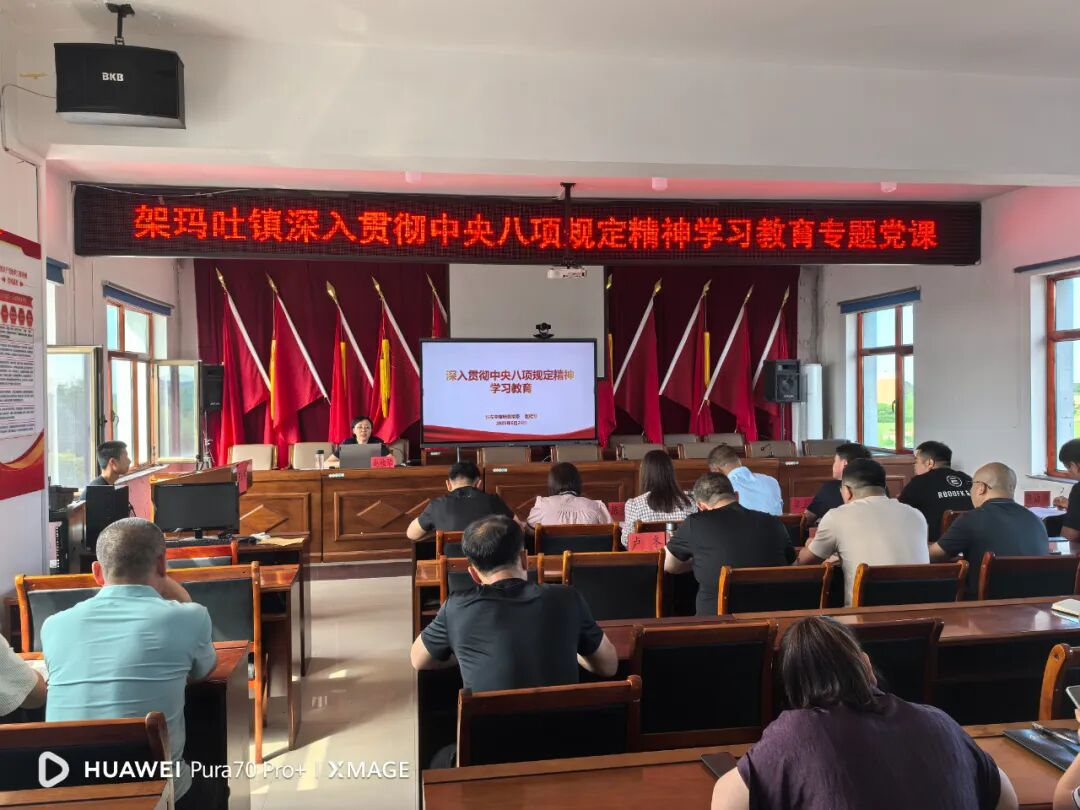 6月20日,架玛吐镇组织召开深入贯彻中央八项规定精神学习教育专题党课,会议邀请旗纪委常委赵桂琴出席授课,围绕深入贯彻中央八项规定精神学习教育相关内容进行细致讲解,镇党政班子成员、环节干部、各嘎查村党支部书记参加会议。