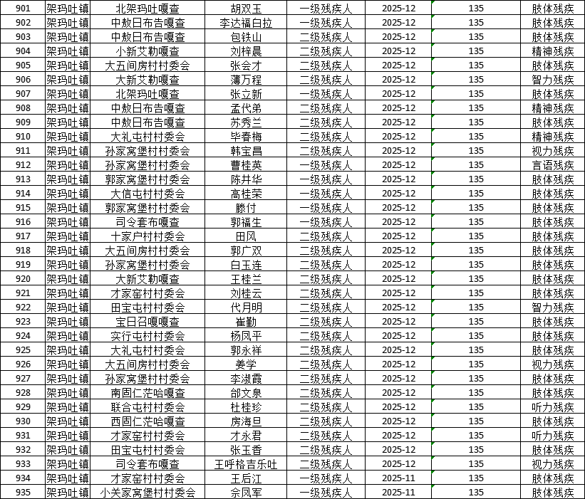 架玛吐镇2025年12月残疾人护理补贴发放花名册