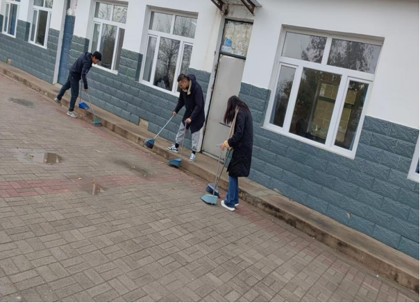 党员教师开展主题党日活动,清理校园周边垃圾,美化环境,用实际行动践行初心使命。