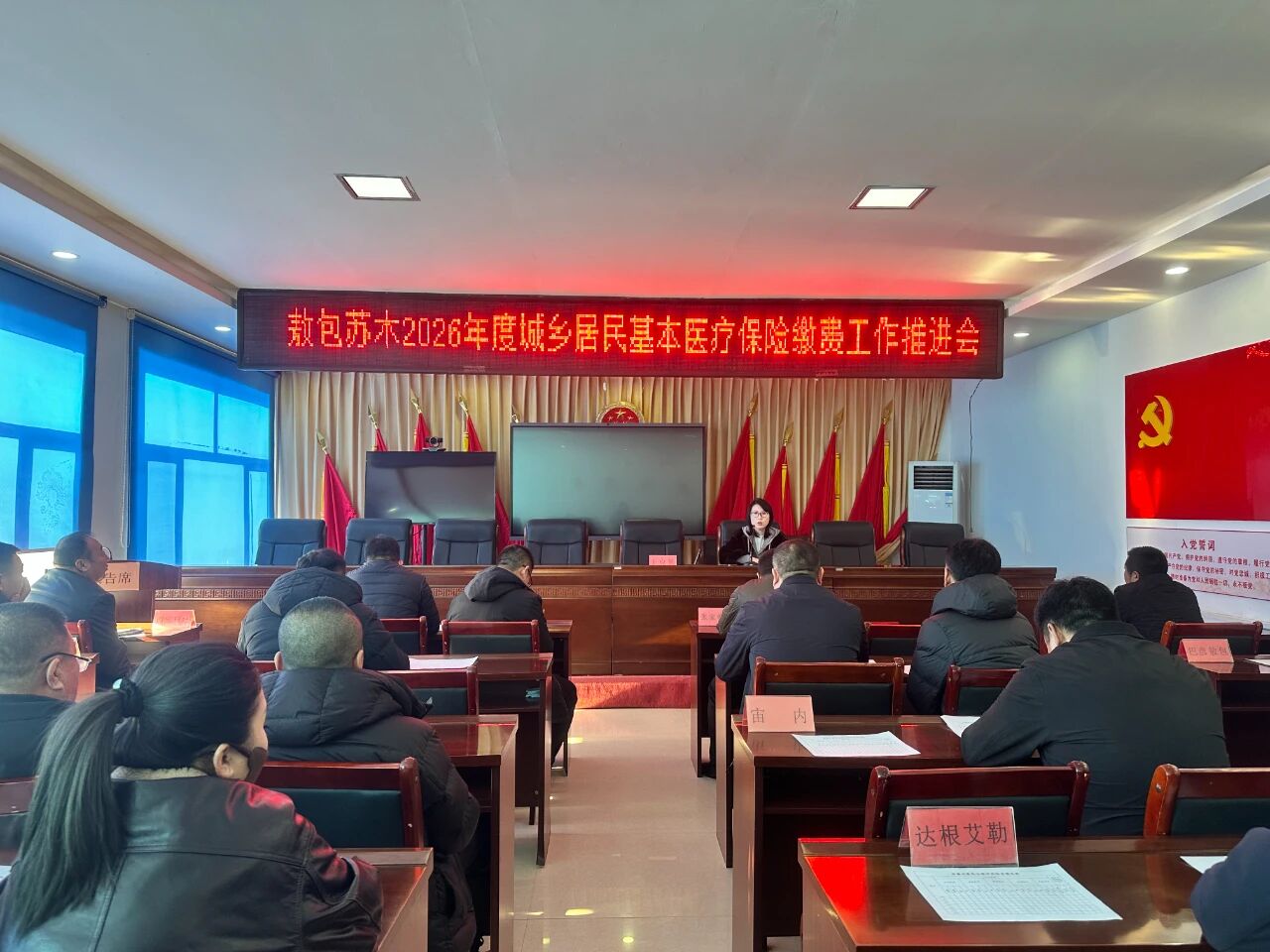 12月12日,敖包苏木政府副苏木达王克勤在苏木大会议室主持召开 2026 年度城乡居民基本医疗保险缴费工作推进会,梳理当前缴费进度、分析存在问题、部署下一阶段攻坚任务,各嘎查村包片片长、工作队队长、嘎查村书记及会计参会。