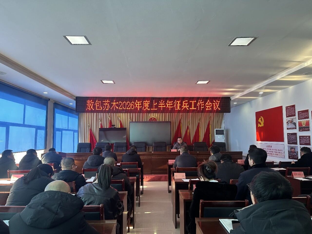 12月12日,敖包苏木政府副苏木达包爱华在苏木大会议室主持召开 2026 年度上半年征兵工作会议,深入贯彻落实上级征兵工作会议精神,分析当前征兵工作形势,部署下一阶段征兵重点任务。各嘎查村包片片长、工作队队长、嘎查村书记及会计参加会议。