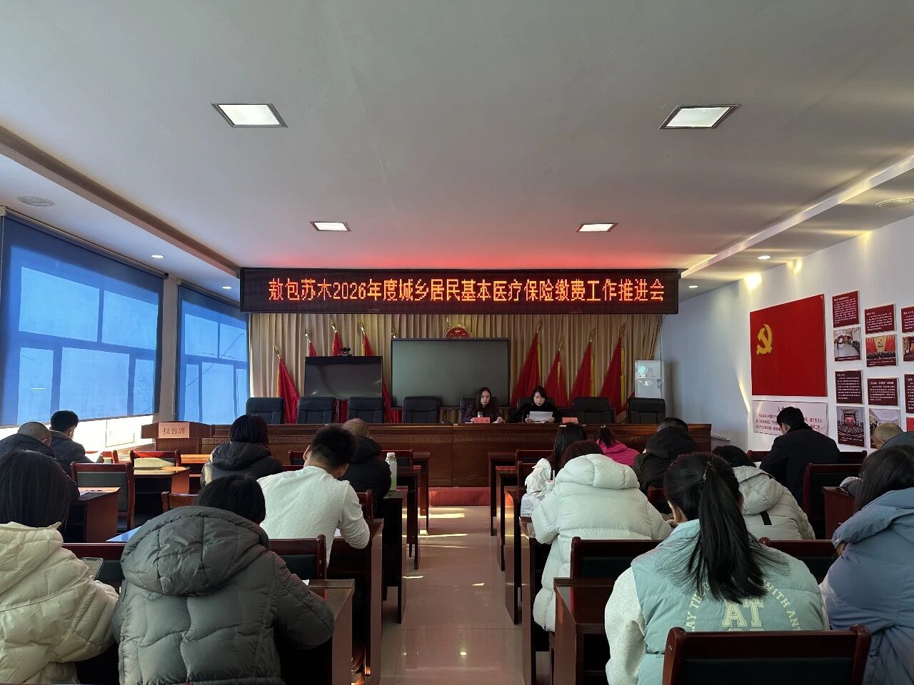 12月16日,敖包苏木党委副书记、政府苏木达白苏敦在苏木大会议室主持召开 2026 年度城乡居民基本医疗保险缴费工作推进会,全面梳理当前缴费工作进展,分析研判存在的难点堵点,对下一阶段攻坚冲刺任务进行再部署、再压实。各嘎查村包片片长、工作队队长、包村干部参加会议。