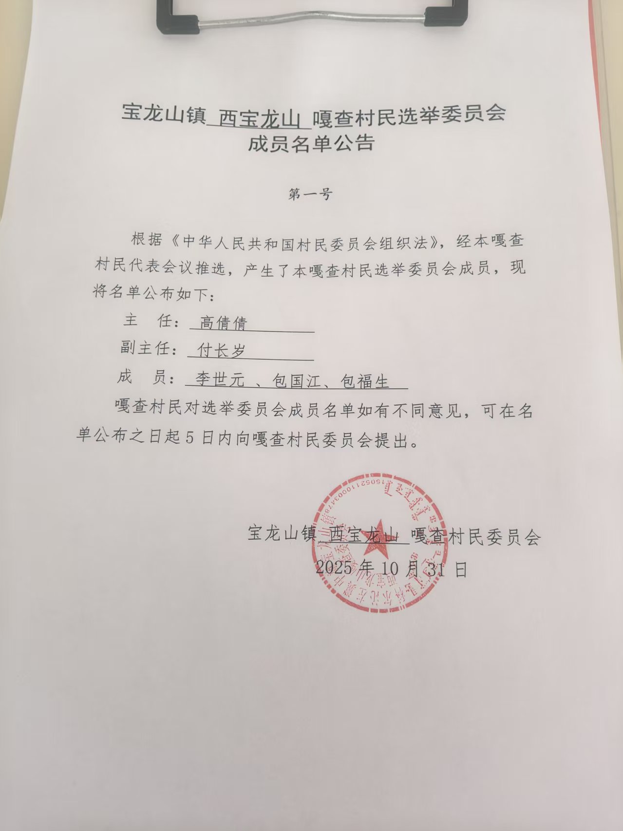 宝龙山镇西宝龙山嘎查村民选举委员会成员名单公告