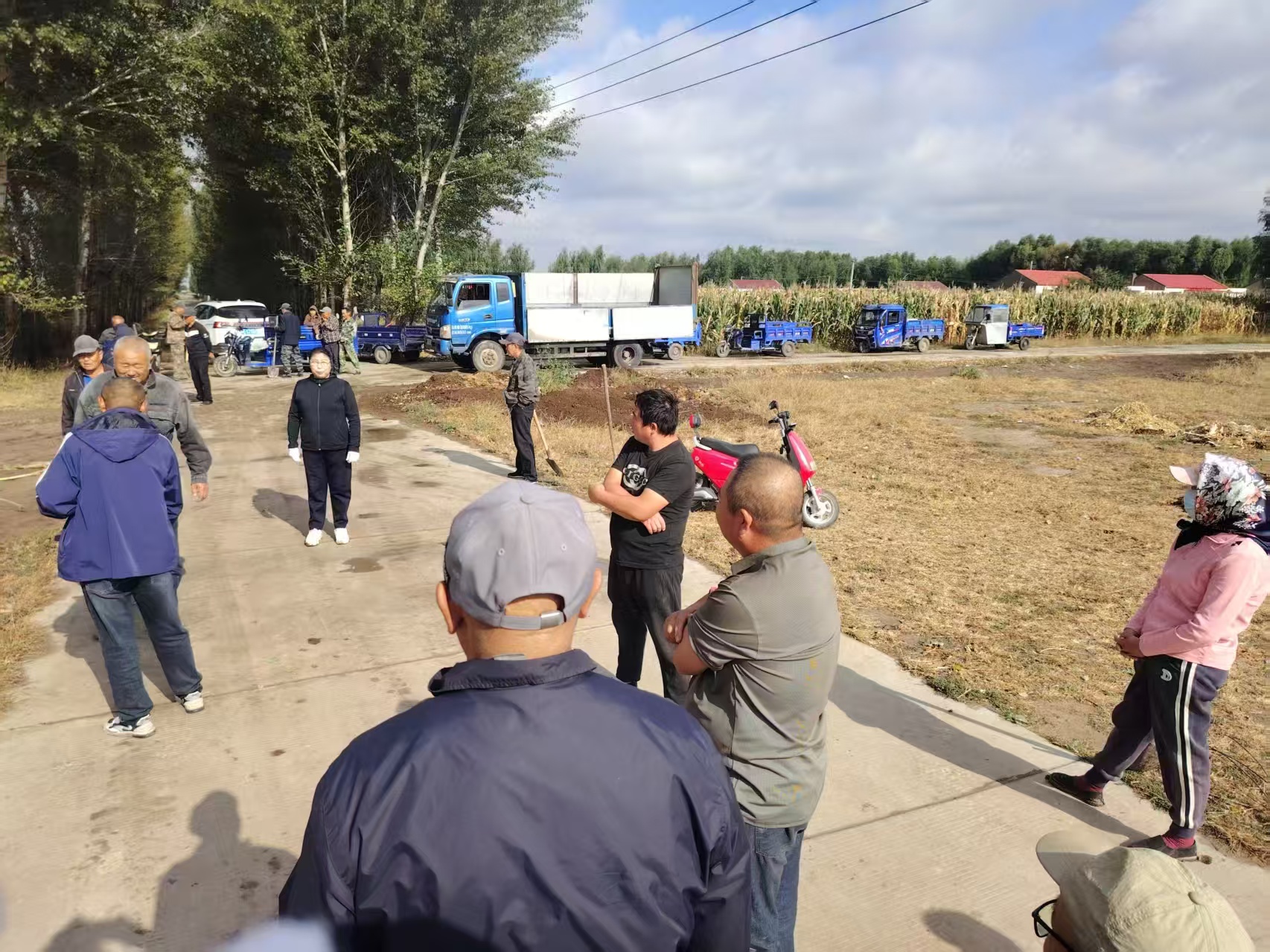 结合主题党日党员带领群众修复田间道路工作。