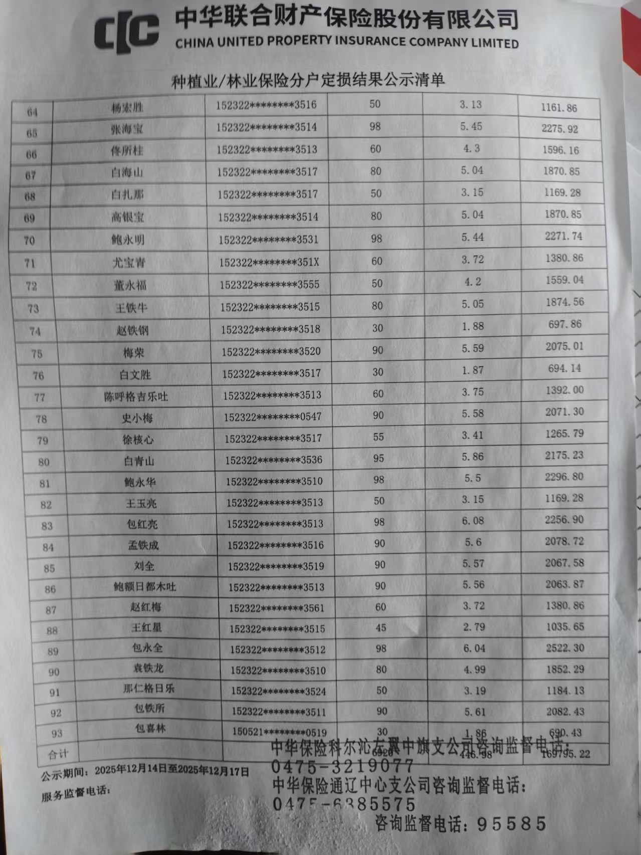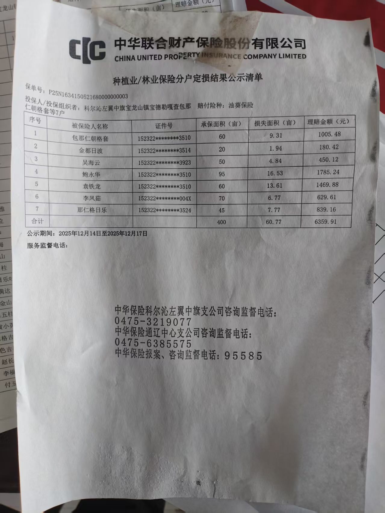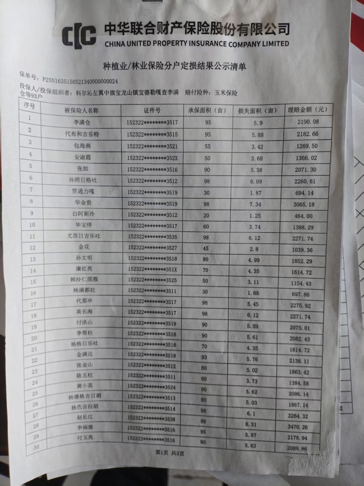 2025年玉米保险明细表