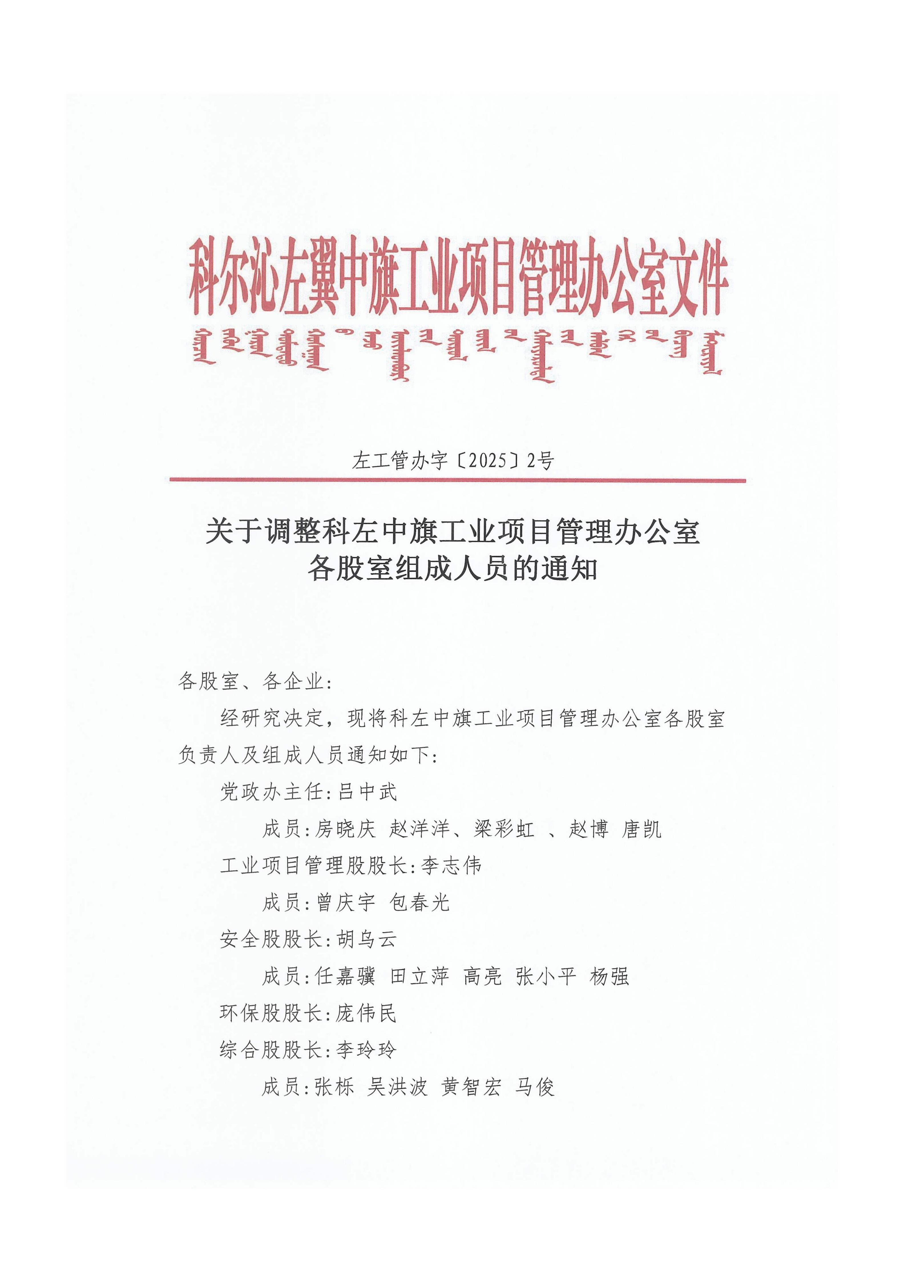 科尔沁左翼中旗工业项目管理办公室各股室人员组成