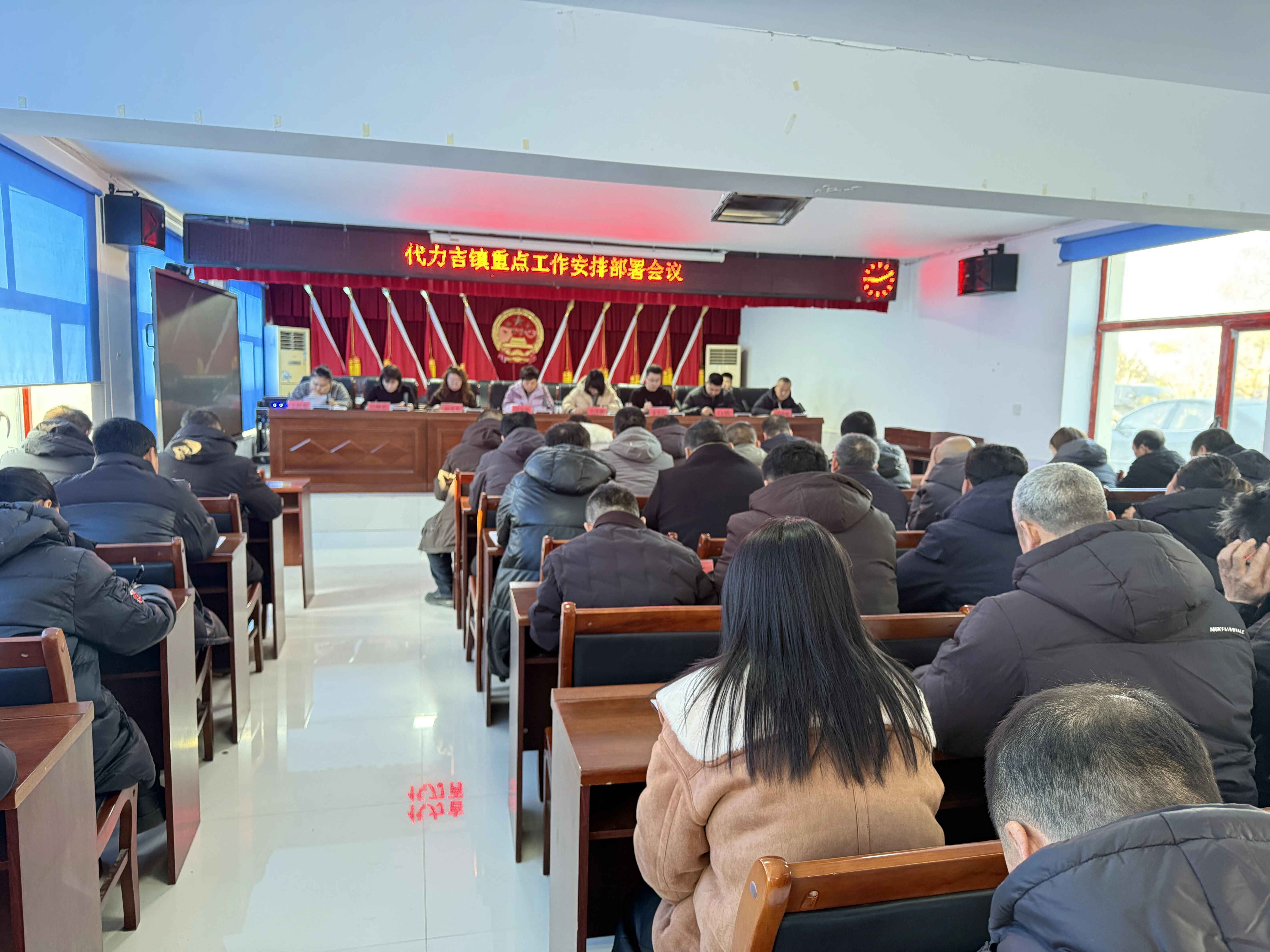 12月30日,代力吉镇召开重点工作推进会议,会议由镇党委书记于金莉主持,镇党政班子成员、包片领导、包村干部、各嘎查村支部书记、报帐员、计生专干等人员参会。会议对城乡居民合作医疗收缴、环境卫生整治、矛盾纠纷排查化解、安全生产等重点工作进行安排部署。