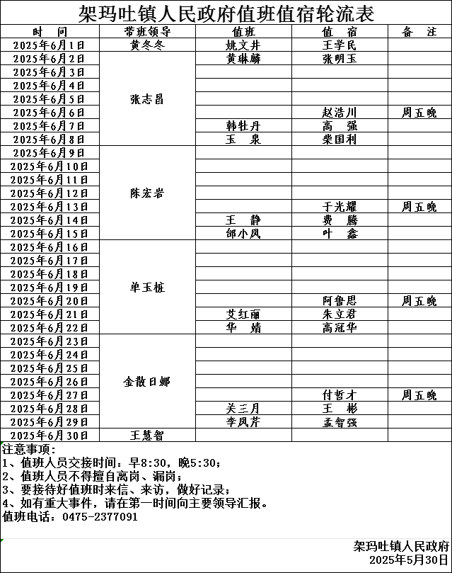 2025年6月架玛吐镇人民政府值班值宿轮流表