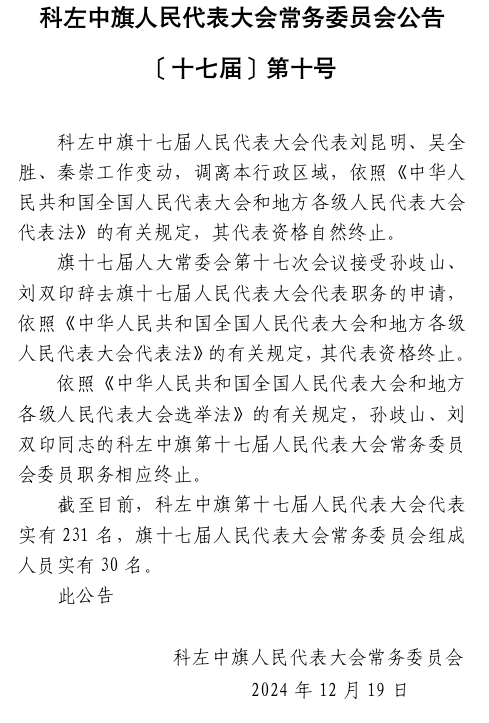 科左中旗第十七届人大常委会第十七次会议公告、决定
