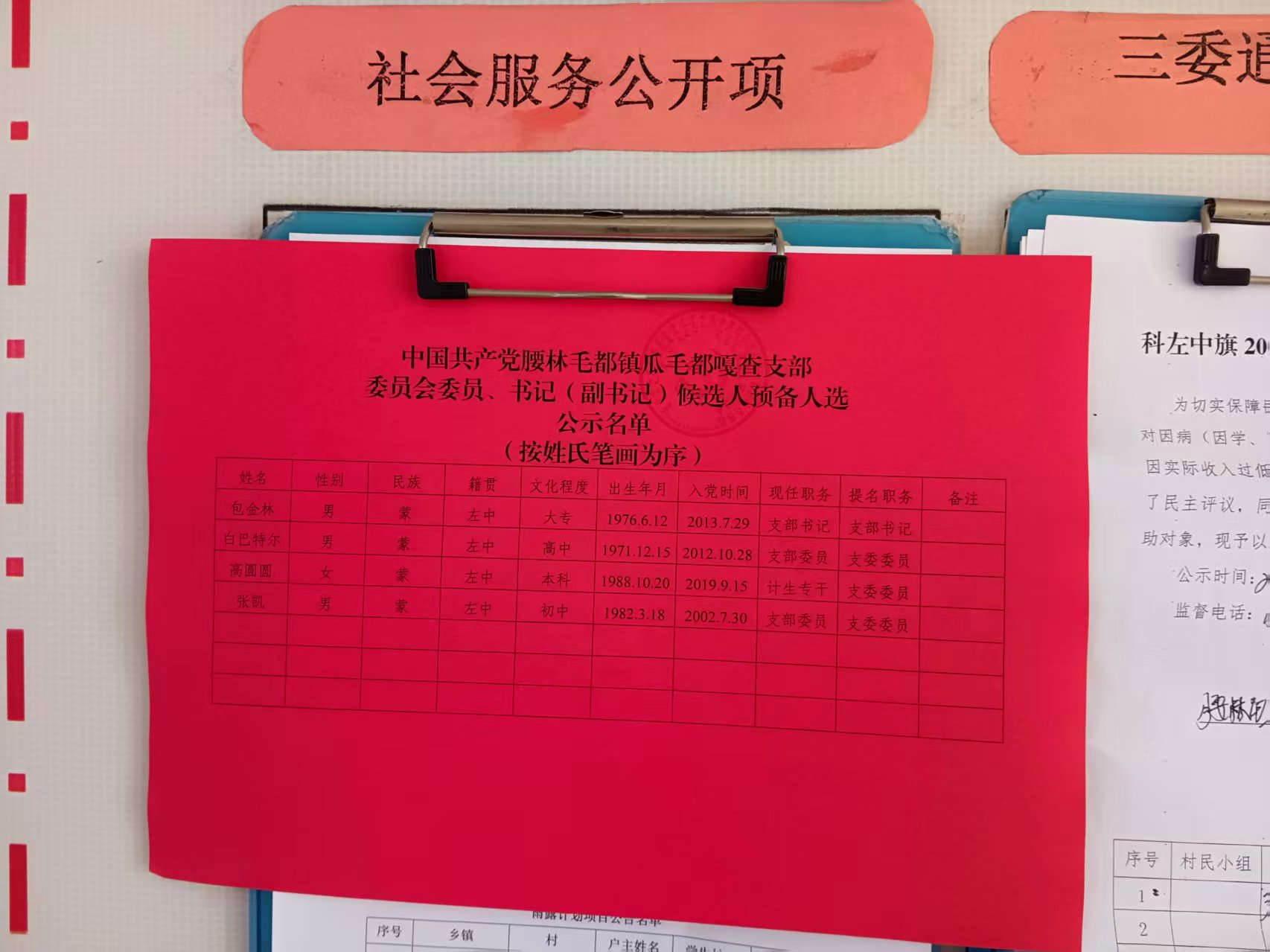 按照《中国共产党章程》等党内法规和上级党组织有关要求,我们于2025年12月30日在村部召开党员大会进行换届选举,应到会党员19名,实到会党员19名,实到会人数不少于应到会党员人数的 4/5,会议有效。大会以无记名投票、差额选举的办法,选举嘎查党支部委员3名,他们是包金林(18票)、白巴特尔(19票)、张凯(12票);新当选的党支部委员召开会议以等额选举的办法,选举包金林(3票)为嘎查党支部书记。