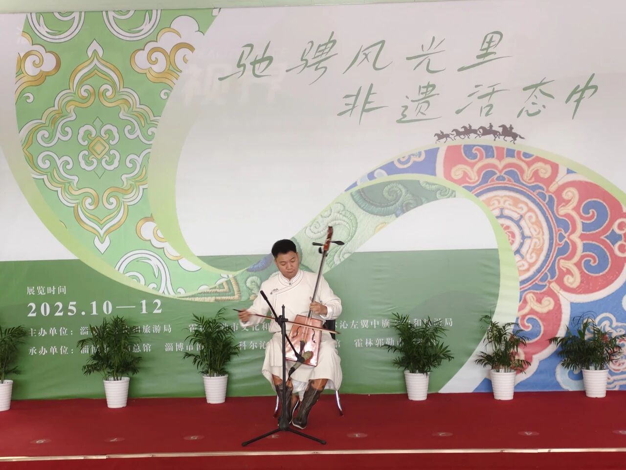 开幕仪式现场,淄博市博物馆与科尔沁左翼中旗博物馆正式签署《合作框架协议》,标志着两地文博领域深度协作开启新篇章。随后,科尔沁左翼中旗乌兰牧骑为现场观众献上极具蒙古族文化特色的艺术盛宴:马头琴独奏《万马奔腾》旋律激昂,尽显草原儿女的豪迈气概;科尔沁长调民歌《金泉》悠远醇厚,让观众沉浸式感受北疆音乐的独特魅力;四胡与三弦二重奏《双马同蹄》节奏铿锵,生动诠释了蒙古马昂扬奋进的精神内核。精彩的演出赢得全场观众阵阵热烈掌声,充分展现了科尔沁文化的深厚底蕴与艺术感染力。