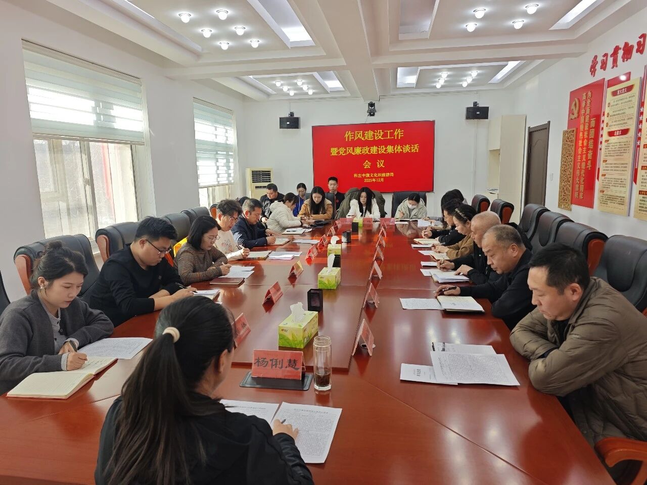 12月12日,科左中旗文旅局组织召开作风建设工作暨党风廉政建设集体谈话会议,文旅局党组书记、局长杨俐慧主持会议,党组成员、各二级单位负责人、局机关干部及各支部党务工作者参加会议。