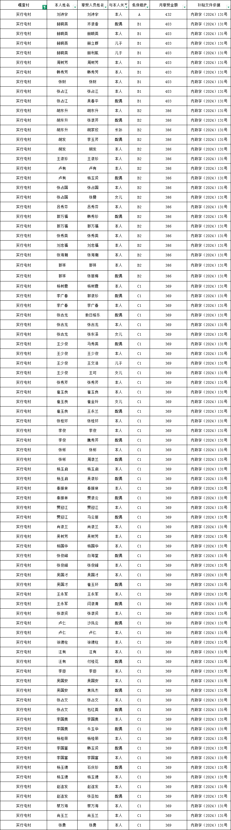 实行屯村2026年1月农村低保资金发放花名册