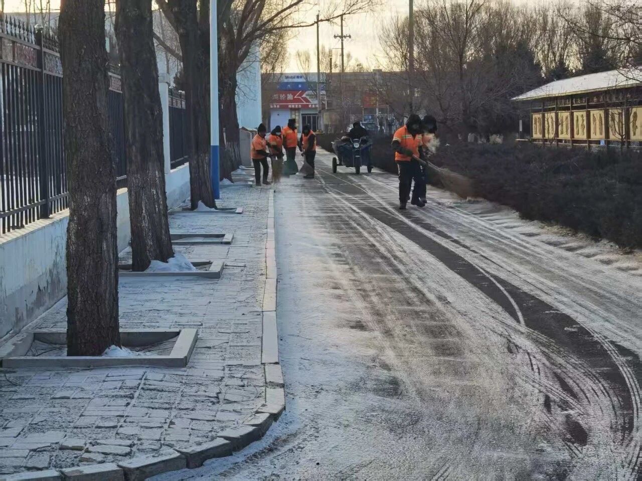 1月27日,架玛吐镇综合执法队组织环卫工作人员,对政府广场及辖区沿街道路开展全面扫雪除冰作业。大家齐心协力、密切配合,扎实清理积雪积冰,全力消除道路通行安全隐患,切实保障群众出行安全、畅通辖区道路通行环境,筑牢冬季道路安全防线。