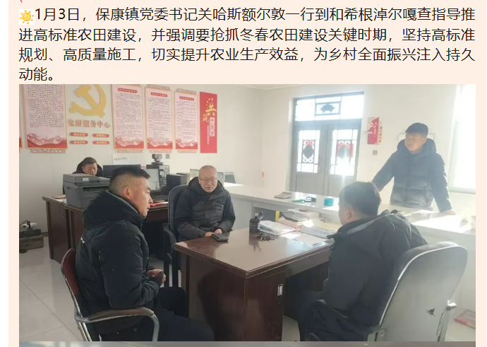 1月3日,保康镇党委书记关哈斯额尔敦一行到和希根淖尔嘎查指导推进高标准农田建设,并强调要抢抓冬春农田建设关键时期,坚持高标准规划、高质量施工,切实提升农业生产效益,为乡村全面振兴注入持久动能。