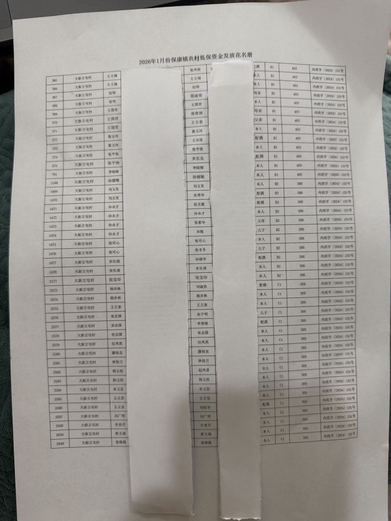 保康镇大新立屯1月份农村低保资金发放花名册