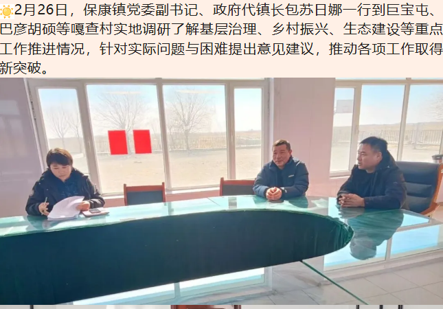 2月26日,保康镇党委副书记、政府代镇长包苏日娜一行到巨宝屯、巴彦胡硕等嘎查村实地调研了解基层治理、乡村振兴、生态建设等重点工作推进情况,针对实际问题与困难提出意见建议,推动各项工作取得新突破。