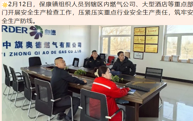 2月12日,保康镇组织人员到辖区内燃气公司、大型酒店等重点部门开展安全生产检查工作,压紧压实重点行业安全生产责任,筑牢安全生产防线。