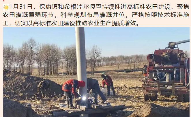 1月31日,保康镇和希根淖尔嘎查持续推进高标准农田建设,聚焦农田灌溉薄弱环节,科学规划布局灌溉井位,严格按照技术标准施工,切实以高标准农田建设推动农业生产提质增效。