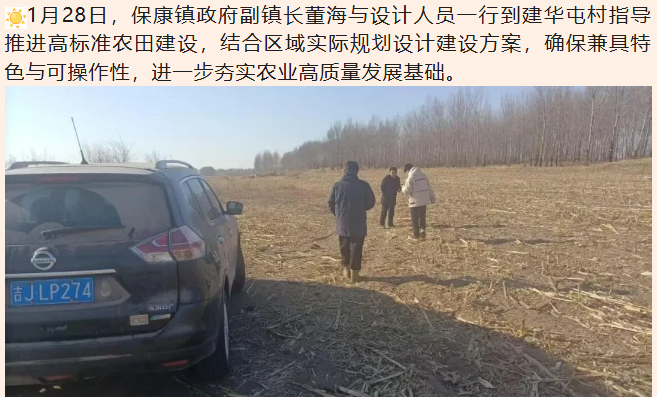 1月28日,保康镇政府副镇长董海与设计人员一行到建华屯村指导推进高标准农田建设,结合区域实际规划设计建设方案,确保兼具特色与可操作性,进一步夯实农业高质量发展基础。