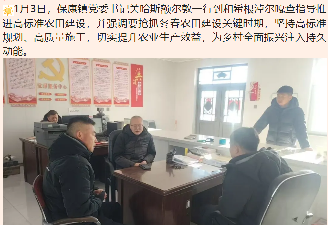 1月3日,保康镇党委书记关哈斯额尔敦一行到和希根淖尔嘎查指导推进高标准农田建设,并强调要抢抓冬春农田建设关键时期,坚持高标准规划、高质量施工,切实提升农业生产效益,为乡村全面振兴注入持久动能。