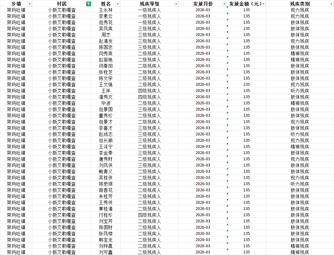 架玛吐镇小新艾力嘎查2026年3月残疾人生活补贴发放花名册